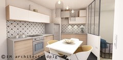 Commentaires (11)Bonjour, voilà une vue de ce qui pourrait être votre futur espace de vie. J'ai ajouté une verrière entre la cuisine et le salon/salle à manger pour apporter plus de lumière. La cheminée est remplacée par un poêle encastrable pour dissimuler le morceau de mur porteur restant et y incorporer du rangement pour le bois. Je vous propose la prestation "shopping list" de SYSTEME D.CO, je réalise pour vous la liste de meubles et objets (avec toutes les références) en fonction de votre budget et de vos envies. Plus de renseignements sur www.systemedco.com... Voir plusBesoin d'aide pour aménagement salon salle à manger et cuisine