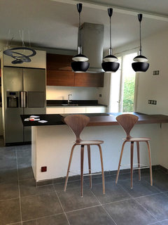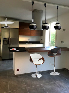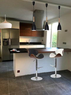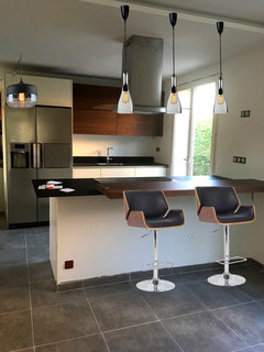 Commentaires (43)Bonjour Béné, Très sympa et très lumineux, même si je n'imaginais pas l'alliance parquet carrelage de cette manière... Je pensais que vous vouliez mettre le carrelage uniquement côté cuisine et le parquet côté table et séjour... mais votre choix a un sens compte tenu de l'architecture du lieu. :) Les couleurs des tabourets et du "canapé-télé" ajoute de la gaieté à l'ensemble. Je trouve que le coin salle-à-manger manque un peu de contraste par rapport au reste. Sûrement le coloris neutre de la table et du buffet assez massif ajouté au gris de la cuisine et du carrelage... j'aurais bien vu une table plus "aérienne" et peut-être noire? Mais c'est un détail, et "des goûts et des couleurs..."etc...etc! A quoi sert d'avoir garder ce qui devait être, je pense(?), les caisson des volets des anciennes baies vitrées entre la salle à manger et le coin salon? Et la question subsidiaire reste: "Mais où est donc passé le piano??" :D Bon, bonne rentrée, et bonne continuation pour les travaux.... Voir plusconseils pour aménager espace salon/cuisine et bon coin repas
