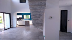 Commentaires (6)Bonsoir, Je ne suis pas sur de comprendre la cuisine "ouverte" séparée du salon par un refend... ça veut dire, vers la petite fenêtre, là ou on voit du carrelage bleu? Serait-il possible d'avoir un plan avec les portes, fenêtres, espace bureau avec son faux plafond, cuisine, escalier noir? L'implantation des poutres métalliques et parties en faux plafond? Des indications des éclairages appliques, spots ou suspensions? "Beach cottage" est super sympa... (pourvu que vous n'êtes pas trop loin de la plage). je ne pense pas qu'il faut avoir peur du coté "layette". C'est vous qui mettrez les bleus ou turquoises, aussi soutenus que vous souhaitez. Votre sol est par contre, un peu froid. Vous allez vouloir le réchauffer avec des tapis sisal, ou beige / taupe. Votre mobilier jouera énormément. Alors, c'est l'histoire de la poule et l'oeuf...mobilier déjà sur place? choisi? commandé? Si oui, lesquels? bonne soirée, Lynn... Voir plusChoix d'un sol pour le séjour