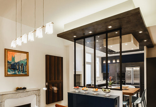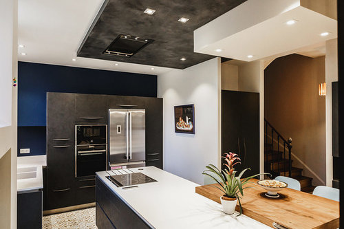 Pour cette rénovation, nous avons effectué un changement de la cuisine, redistribué les volumes, créé un espace accueil et bureau et déplacé la salle à manger.