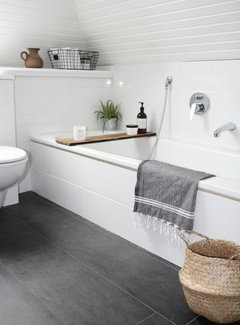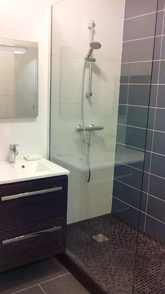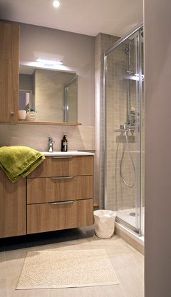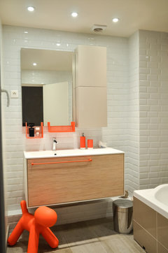 Commentaires (26)Une applique murale au dessus du miroir serait adéquate pour le maquillage ou juste pour une bonne vision surtout le matin. La lumière pendante peut être dangereux dans la salle de bain ( mais il est vrai que d'après la photo on ne peut pas voir à quelle hauteur elle est ) Sinon je trouve que cette salle de bain est très belle et fait ''hygiénique'' comme quelqu'un en a fait la remarque avec la palette qu'elle a. Des belles serviettes moelleuses, un tapis et /ou des accessoires de couleur apporterait une note de couleur et de chaleur au gris qui paraît souvent froid surtout dans une salle de bain. Je suis d'accord avec l 'idée de mettre une belle toile sur le mur et d'en tirer les couleurs accents pour les accesoires , mais toujours utiliser la ventilation mécanisée à chaque douche ou bain pour éviter tout humidité.... Voir plusQuelle couleur de sol pour une salle de bain verte