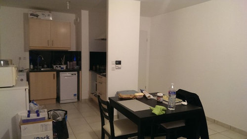 Commentaires (7)Bonjour Ann-C, La cloison en question a été prévue, je suppose, pour cacher le réfrigérateur, ce dernier se trouvant à la place actuelle de la cuisinière au tout début du projet. En effet, apercevoir le la profondeur d'un frigo n'est pas des plus décoratif. Le promoteur a ensuite décidé d'inverser l’emplacement du frigo et de la cuisinière sans doute en raison de contraintes techniques. Cette modification pourrait donc permettre de ne pas avoir de cloison donc vu du salon sur la cuisinière par prolongation jusqu'à l'intersection (ceci dit, on verrait le profil de la hotte) et ainsi d'avoir coté allège (entre allège et radiateur) un plan de travail/coin repas. Ainsi, j'ai 1m en circulation intérieur, du rangement/espace de travail supplémentaire. Mais effectivement, comme le souligne Emilie Melin, cela mange l'espace. Votre idée de L est effectivement la meilleure idée, il me semble, pour conserver l'espace mais comme je le disais, je recherche du rangement et du plan de travail pour y mettre tout mon petit matériel et vaisselle car la cuisine...c'est très très important pour moi. S'il y a un plan coté allège, j'ai alors pensé à laisser la TV à l'emplacement prévu par le promoteur et mettre un canapé 3 place le long du mur donnant sur la chambre 2. De cette manière, on laisse l'espace ouvert. J'aurai aimé mettre un canapé d'angle mais ce sera pour un autre projet vu la contrainte ;-) Je suis tout à fait ouverte à tout proposition.... Voir plusBesoin de vous : aménagement séjour/SàM sur cuisine ouverte (40 m²)
