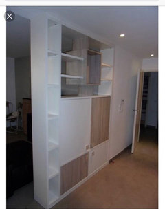 Commentaires (1)Bonjour. Une suggestion qui nécessite une cloison (éventuellement de type amovible) entre cuisine et entrée (en bleu clair) J'ai rajouté un frigo à vos demandes ! Avec de gauche à droite - un meuble cuisson (four + plaque) surmonté d'un meuble hotte - un meuble d'angle (haut et bas) - un meuble évier + meuble haut micro onde - un lave vaiselle petit format (50) + meuble haut rangement - une colonne froid Cette cuisne occupe 155 x 265 cloison comprise. Mais, 1 - elle manque de meuble à tiroirs et de plan de travail. J'ai donc prévu une extension côté fenêtre composée de 2 meubles à tiroirs de 40 X 40 reliés en pont par un plan de travail qui peut servir autant à la préparation, qu'à la prise d'un repas rapide. 2 - la cuisson un peu proche de l'évier ne permet pas de travailler à 2. Je préfèrerais inverser le lave vaisselle et l'évier, pour raison de sécurité. Je préfère un évier trop près de la colonne froid que tropprès de la cuisson. Et vous ? Une circulation de 80 cm est préservée partout (en jaune) A gauche de l'entrée, on peut caser porte manteaux et casiers à chaussures. Deux aspect possibles, uniquement organisationnel sans aucune idée déco (les meubles sont ceux disponibles dans le logiciel cuisine d'Ikéa)... Voir plus- il y a 8 ans