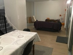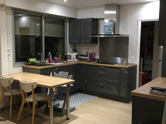 Commentaires (9)Bonjour iona longoni Je vote plutôt pour la version 1, malgré quelques améliorations possibles. Votre salon est plus aéré, vous avez la place pour le gros fauteuil, vous accéder directement à la cuisine depuis le garage et votre table semble assez grand avec assez d'espace autour. Les points négatifs? cuisine pas optimisée, manque PAC et le placard d'entrée créé des chicanes augmentant la circulation au détriment de l'habitabilité. L'analyse de la version 2...microscopique salon bloqué par le gros fauteuil rond. Accès wc plutôt bien caché, mais que pour les enfants ou gens de très petite taille. Les espaces en général sont disproportionnés. Voila une proposition avec un local technique pour la PAC qui donne directement sur le jardin. Vous avez un placard d'entrée, dans l'entrée, qui aide à protéger le salon des vues. Le wc est bien glissé sous les marches avec une paroi pleine qui l'isole par rapport à une vue depuis e salon. Le salon s'agrandit avec le canapé au centre, votre gros fauteuil rond devant la fenêtre. La table n'est pas changée par rapport à votre plan 1. Par contre, l'accès depuis le garage à la cuisine a été modifié afin de vous créer une arrière cuisine, toujours utile, surtout pour une cuisine ouverte. Dans la cuisine, les éléments les plus "bazar" restent sur le mur du garage, pas visible depuis le salon, et avec une vue rasante depuis la table. Vous gardez un îlot et bar pour la convivialité. Entre vos 2 plans, les fenêtres (surtout la porte-fenêtre, je pense face au fond du garage) ne sont pas détaillé en taille ni implantation... bon courage, Lynn... Voir plusBesoin d'aide et de conseils pour l'aménagement de notre pièce de vie.