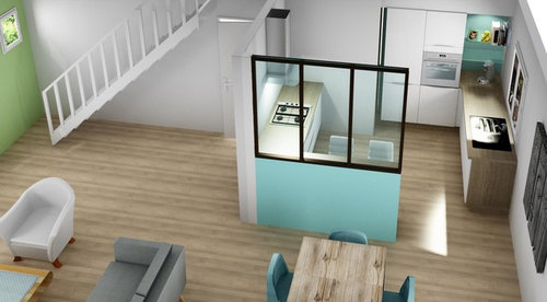 Commentaires (125)Bonjour à tous, Oui, jaune, orangé, et rouge sont des couleurs chaudes, qui apportent chaleur à une pièce. Il y a le brun doux proposé plus haut et d'autres nuances. Mais si vous n'aimez pas ces couleurs, demeurez dans la palette que vous aimez et dans laquelle vous vous sentez bien. En évitant à mon avis, les couleurs à la mode, qui se démodent bien vite. Sauf si vous prévoyez un budget pour changer la décoration en suivant régulièrement la mode. Et en évitant le gris, trop vu et revu. Dans les bleus proposés, je choisirais pour leur clarté et leur gaieté : - Le bleu clair lumineux de la photo de Premium décoration - Le bleu azur lumineux de la photo de Stéphanie Gruselle. J'éviterais le vert sombre et le bleu canard, que je trouve "durs" et foncés. En tout cas, si votre pièce reçoit sa lumière du Nord, il ne faut à mon avis, pas de couleur foncée. Il me semble que cela mangerait de la lumière et qu'il faut au contraire apporter de la lumière et de l'espace à la pièce, outre le fait que le foncé est souvent triste. Bon courage pour la suite des travaux !... Voir plusquel plan pour inventer ma nouvelle cuisine?