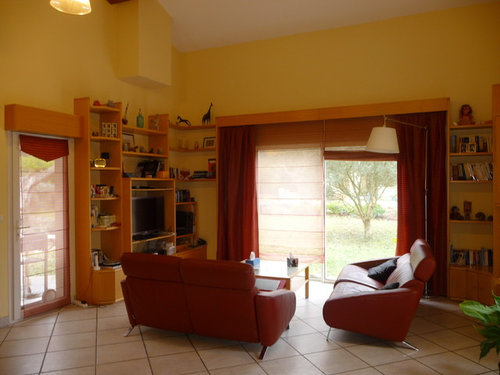 Commentaires (0)Bonjour à tous, Je reprends la réflexion que j'avais déjà un peu menée sur mon coin salon, car ça revient à l'ordre du jour. Que faire pour avoir des rangements harmonieux sur ce grand mur? J'aimerais aussi utiliser le mur de droit qui fait 1m06 de largeur. Nous avons 2m50 de mur au niveau tv jusqu'au radiateur. Ce mur a été peint en bleu Pavilion Blue de F&B jusque dans l 'escalier, nous souhaiterions pouvoir le voir encore! Nous aimerions beaucoup nous inspirer de ce qu'a fait Marion Lanoe, des meubles blancs avec du bois et un peu cette disposition là, sauf que j'aimerais suspendre les meubles bas, et ajouter un rangement sur le mur du petit retour. Qu'en dites vous? Et la problématique radiateur je la contourne comment? (radiateur à eau PAC) Nous aimerions éventuellement avoir un bureau d'appoint, ou centre de commandes, à l'intérieur d'un des rangements (celui sur le pan à droite?), comme sur cette photo qui m'inspire beaucoup : A votre avis c'est faisable? Sachant que le muret sous l'escalier va être ouvert pour faire un rangement caché à cet endroit. Que la table basse va bien sur partir au profit d'une table blanche et bois style scandi. Le canapé ne bougera pas par contre! Mais out le noir des meubles je n'en peux plus! Merci pour vos avis.... Voir plusComment habiller un mur exterieur de 4 m face a nos fenêtres
