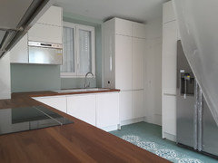Commentaires (7)Bonjour, Perso, j'aurais fait le plan gris en "cascade", et une crédence blanche quasi invisible jusqu'au rebord de la fenêtre. Le côté blanc des meubles contre la façade cri "pas fini"! Un arrêt obligé sans réflexion. Le petit bout de crédence grise ne protégera pas le mur peint restant jusqu'à l'appui. Il me semble qu'au dessus des meubles hauts blancs, qu'il y a des panneaux de finition qui vous prolongent la lecture des caissons. Très bien! Si vous modifiez le plan en cascade, une plinthe noire non-interrompue jusqu'au mur à droite de l'armoire soulignera le tout, avec une ligne qui part du plan a gauche. Désolée, je suis dans le métro. Je peux vous faire un petit visuel cet après midi. Bon courage, Lynn... Voir plus- il y a 7 ans