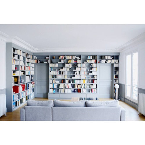 Commentaires (37)Bonjour à tous, Je vous joins des photos de la bibliothèque. J'ai utilisé des caissons Ikea d'occasions et uniformiser en achetant les portes neuves. Pour répondre à la question du coût: au total j'ai payé 180€ tous les caissons sur Leboncoin. 80€ environ la peinture bleu chez Sarah Lavoine. 250€ pour le bois dans une scierie près de chez moi. Le bois a été utilisé pour la bibliothèque, une meuble sur mesure dans la cuisine et des étagères dans les WC et le bureau. Ils ont fait les découpe eux mêmes donc c'était super pratique. Et 250€ de main-d'œuvre pour tout sur 2 jours. La bibliothèque fait 3m de long sur 230 de haut et 40cm de profondeur.... Voir plusbibliothèque sur mesure