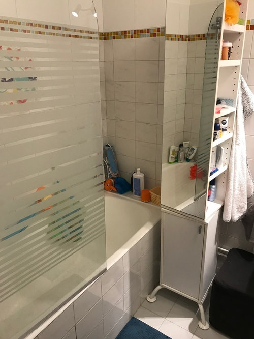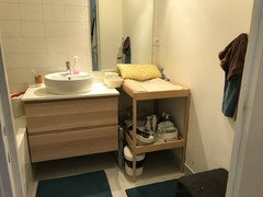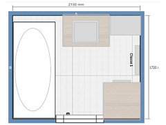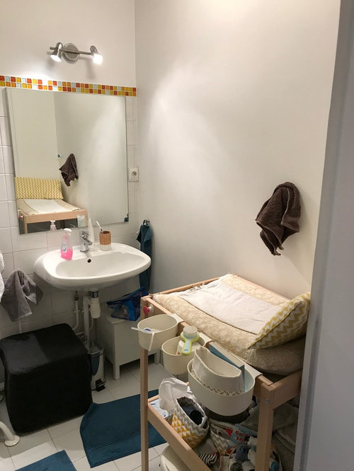 Les contraintes sont les suivantes : nous devons prévoir un place pour un sèche linge qui servira également de table à langer, du rangement, un radiateur électrique sèche serviette et un petit banc/pouf (toujours pratique pour donner le bain sans se casser le dos) et pourquoi pas un petit meuble de plus dans le coin du côté de la porte.