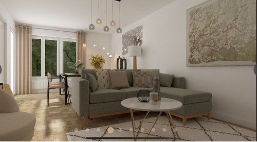 Commentaires (18)DCO Sphère. Pour le positionnement des meubles, je vais effectivement revoir cela, j'avais essayer le canapé contre la fenêtre mais pas encore dans ce sens là, mais je vais voir comment placer le meuble télé, il est un peux imposant mais ca ferait plus décalé, j'aime beaucoup l'idée. voici une vue depuis l'autre côté de la pièce. le couloir n'est pas encore refait, je l'adapterai au salon Pour les corniches je commence à visualiser, je prendrais surement une couleur pas trop foncé, pour ne pas trop démarqué les pièces, surtout si je personnalise le mur où il y a la télé, qu'en pensez-vous? Je vais surement trop vite en besogne, je vais attendre d'avoir votre avis, avant de pensez à choisir une couleur plus foncé ou une tapisserie imitation boisé. Merci pour votre patience.... Voir plusConseil décoration ameublement salle à manger, salon