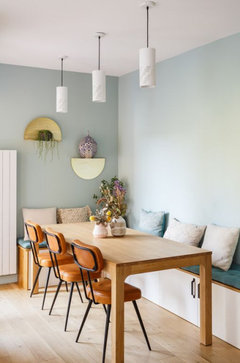 La table a elle aussi bougé pour se retrouver à la place du canapé. J'ai mis un banc contre le mur, cela permet de gagner de la place et en plus vous gagner un peu de rangement dans ce banc. Là aussi vous pouvez délimiter l'espace en peignant les 2 pans de murs en angle ainsi que le plafond pour vraiment délimiter l'espace salle à manger. Voici une photo pour illustrer mes propos (ne faites pas attention à la couleur) :