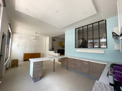 Commentaires (4)belle reno! le bleu se marie bien avec le bois. A mon avis,il manque un rappel de ce bleu dans la cuisine sur un mur,ou de la vaisselle dans les tons, le chant de l'étagère.... c'est un four au dessus de la hotte? si oui,un peu périlleux pour les plaques,pas facile d'accès... dommage!... Voir plus- il y a 2 ans