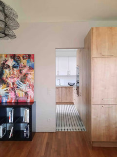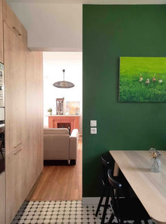 Commentaires (12)Bonjour, Vous avez une belle luminosité dans votre maison, et ce grand mur... Si je peux me permetttre, la peinture en soubassement/mi-hauteur sur ce mur est une erreur: cela tasse votre piece et casse cette hauteur de plafond qui pour moi est un atout. Voila ci dessous ce que j'aurais fait. Il audrait fallu mettre l'accent sur le mur en hauteur, pas en cassant la ligne à moitié comme c'est actuellement. J'aurais peut etre aussi intervertit les pièces: mettre le salon à la place de la salle à manger. Cela ferait un espace plus "intime" pour regarder la télévision ou prendre l'apéritif entre amis. Et mettre la table a manger dans ce espace avec une grande hauteur sous plafond pour vous permettre d'y mettre une suspension (ou plusieurs). Il faut faire un essai, mais pour moi cela dégagerait plus l'acces à la porte fenètre, resoudrait vos espece perdu (vous pourriez y mettre le fauteuil). Vous parlez d'une cheminée, un poele à bois peut etre? Avez vous deja reflechi où le mettre? Je vous conseille de prendr une apres midi à essayer cette nouvelle configuration en changeant le salon avec la salle à manger. Vous dites aimez recevoir: imaginez vos amis, famille dans cette piece haute de plafond, un diner à cet endroit. Qu'en pensez vous? Ingrid Architecte d'intérieur... Voir plusAménagement Salon/Salle à manger 28m²