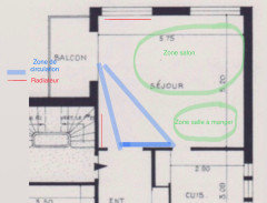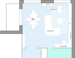 Commentaires (14)Bonjour, J'ai peur qu'il y a un piège quelque part... La seule choses à modifier par rapport à mon plan est le meuble tv qui passe devant les fenêtres (toute hauteur, j'avais zappé ce point). Mais si vous mettez une bibliothèque toute hauteur aux extrémités et un meuble bas entre les fenêtres, vous aurez un salon assez harmonieux. Depuis l'entrée, possibilité d'un claustra avec banc pour privatiser un peu le reste du salon. Une grande table avec une enfilade sous la grande fenêtre et un vaisselier hauteur limité à 1m10- 1m20 afin de mettre une belle glace. La cuisine semble assez bien telle que, malgré que je ne suis pas hyper fan d'éviers sur l'îlot (pour cause bazar potentiel). Mais la cuisson peut très bien avoir une hotte à extraction, le frigo avec une armoire haute attenante "tiennent" la partie à droite de la porte-fenêtre et vous avez beaucoup de linéaire de plan de travail.. Perso, je mettrai des meubles hauts (aussi que possible pour évier "l'effet cuisine") au dessus des meubles coté cuisson. Je pense même qu'une armoire toute hauteur coté canapé vous aidera à mieux délimiter la cuisine et vous pouvez centrer la plaque de cuisson entre cette armoire et une autre armoire "fours" à droite. Si vous souhaitez un canapé d'angle, c'est entièrement jouable, "reliant" le gros fauteuil au canapé 3 places. Dans ce cas, ajouter un plus petit fauteuil à droite de la table basse. Que dire de plus... bel espace, bon courage, Lynn... Voir plusAménagement salon salle à manger