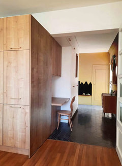 Commentaires (14)Bonjour, Une proposition : 1°) Séparer le bureau par une bibliothèque haute pouvant recevoir la télévision. Comme cela lorsque vous êtes dans votre salon, vous n'êtes plus dans votre bureau !... 2°) Maquer l'entrée par deux meubles dos à dos dont une penderie et une petite bibliothèque Ainsi les personnes qui arrivent n'ont pas de vue directe sur le salon, et vous avez un rangement pour manteaux et chaussures. 3°) La table haute- plan de travail comme vous l'indiquiez. - Les circulations principales sont préservées. - Les différentes fonctions sont bien identifiées. Bon aménagement.... Voir plus- il y a 10 mois