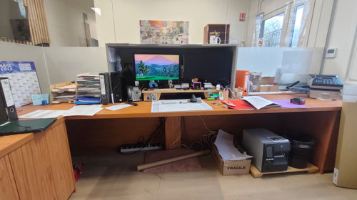 Je ne suis pas standardiste, ni accueil. J'ai hérité de ce bureau vitré et l'environnement Bois. Je ne peux pas modifier la structure actuelle du bureau, or je peux l'améliorer niveau déco, rangement et aménagement.