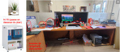Perso, je pensais mettre une autre tablette sous les écrans, et éventuellement mes 3 petits caissons tiroirs à la place de la tour du PC... Mais bien sur, j'attends vos idées avec impatience.