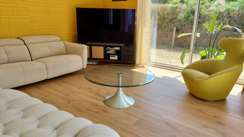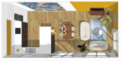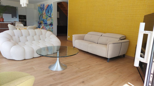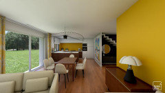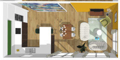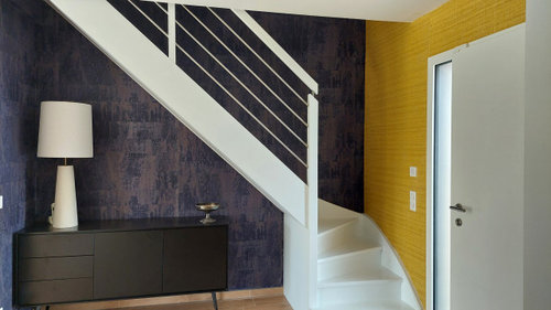 Commentaires (10)Bonsoir, Parfois il faut chatouiller les mauvais points, pour qu'ils deviennent les bons... Un mur bleu poudré, un mur taupe clair, le mur du fond, crème mastic pâle, des détails orange ou cuivrés, quelques étagères noire avec appliques noirs, et de-saturer l'escalier, je mettrai plutôt une lasure gris foncée sur le bois poncé. Si possible retirer les lambris, remettez du BA13 et une mise en peinture un peu fun. A titre indicatif, je poncerai tout simplement les poutres, quitte à les blanchir un peu afin de garder des teintes naturelles du bois clair. Le carrelage n'est pas le problème, plutôt la peinture jaunâtre. et sans les meubles, mais je ne vois pas la cuisine dans cet endroit..c'est quoi dans le passe plat à gauche? En tout cas j'ai caché le placard avec une porte en applique qui rehausse la couleur des poutres et le petit dessin dans le carrelage. bonne soirée, Lynn... Voir plusQuelle couleur pour égayer ce gîte tout en gardant l’authenticité