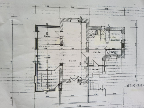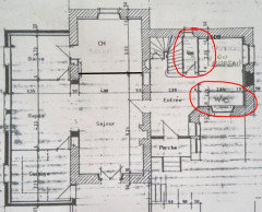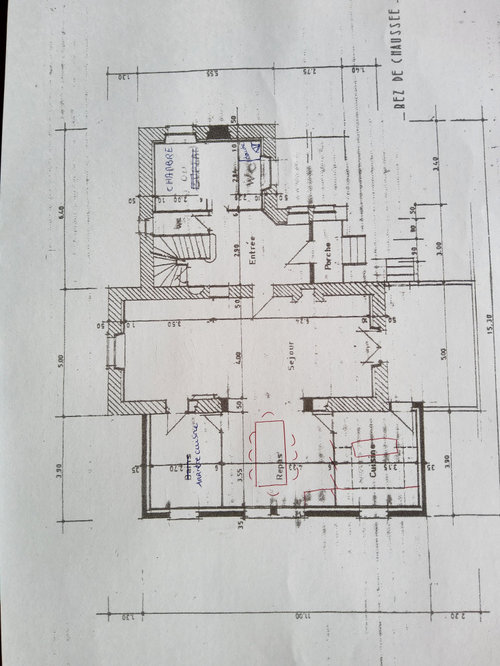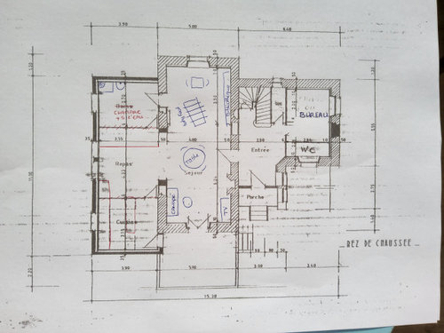 Commentaires (3)Ce post est vieux et n'a pas connu trop de succès, mais voici néanmoins la (pas encore totalement...) fin de l'histoire si ça peut servir d'inspiration à d'autres ! Avant : et voici la configuration finale : En premier, nous avons décidé de changer l'escalier qui nous a permis de gagner beaucoup de place et revoir la circulation dans la pièce. Le palier au dessus a aussi pu être agrandi. Mais surtout, c'est d'envisager de déplacer la cuisine qui a ouvert beaucoup de perspectives. Ca nous a permis d'arriver à avoir d'un côté un grand espace de vie, tourné vers le jardin et organisé autour de la cheminée avec salon / salle à manger / bureau, et la cuisine de l'autre côté, qui reste fermée mais avec une verrière pour la vue et la lumière. La taille de la cheminée a été divisée par deux en y mettant un insert double face, ce qui a permis de la conserver tout en minimisant son volume. En prolongeant la nouvelle cloison de la cuisine, l'entrée se retrouve également un peu mieux isolée du reste de l'étage sans être réduite. Il reste encore des choses à finir sur cet étage, mais avec du recul maintenant nous n'avons aucun regret sur cette configuration !... Voir plusModernisation RDC maison.