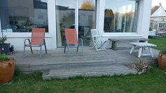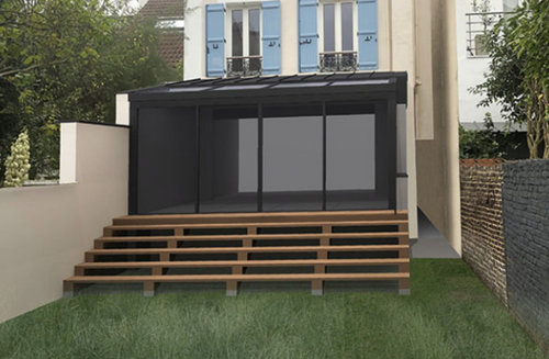 Au départ, il était prévu d’avoir 4 baies vitrées, toutes mobiles. Notre architecte nous a proposé d’avoir un petit perron de 70 cm (refus de la mairie de faire plus grand) et des escaliers donnant sur une terrasse et faisant toute la largeur de la véranda (cf photo).