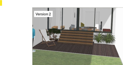 Mais nous venons d’apprendre par le vérandiste, que les 2 baies à gauche et à droite seront fixes, donc elles ne pourront pas s’ouvrir. Du coup, est-ce vraiment utile d’avoir des marches tout du long… ? Ne serait-il pas plus pertinent de faire des marches juste devant les 2 baies centrales qui s’ouvrent, et de pouvoir ainsi aménager les côtés.