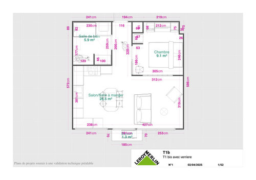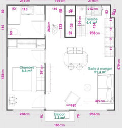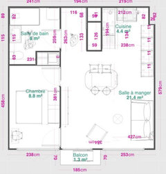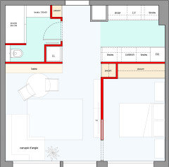 Commentaires (16)Ouf! Il me semblait bien que dans la façade rouge, il y a la fenêtre indiquée que j'ai "ajoutée" pour l'espace lit... Et pourquoi un T1bis et non pas un T2 "légalement"? Car certains régles exigent qu'une chambre fasse 2m20 minimum de large et 9m² minimum. Ca n'empeche pas la création de plus petite chambre, ni une décote au niveau d'une vente, car in finé, on achéte une superficie globale. Elodie Tls , bon courage, Lynn... Voir plusRéaménagement 70m2