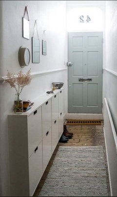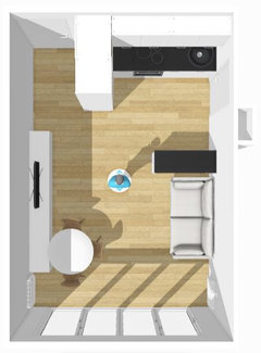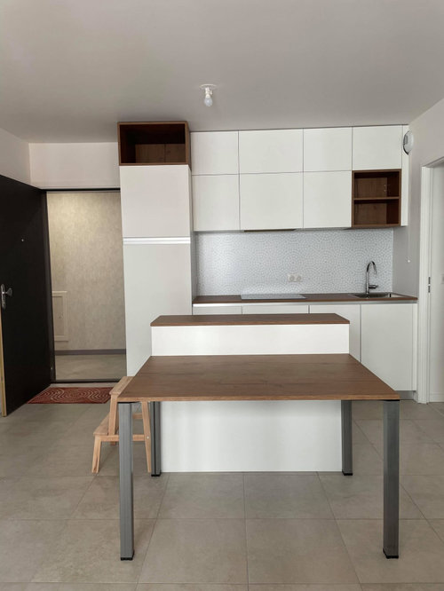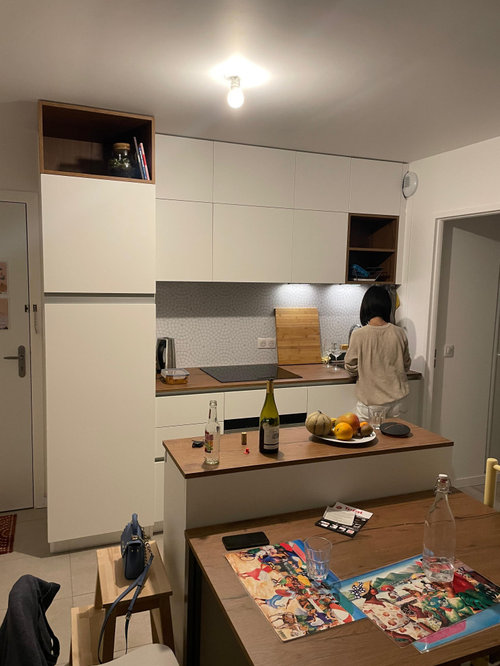 Commentaires (7)Bonjour, Je peux vous proposer 2-3 choses dans un premier temps: Changer vos meubles hauts, prenez des modèles toute hauteur, et sans changement de couleur. Je resterai avec du blanc. Travaillez l'éclairage afin de ne pas avoir un "coin sombre" dans la cuisine. Comme vous avez beaucoup de choses sur le plan de travail, songez également à faire un meuble haut qui démarre du plan de travail avec une porte roulante afin de cacher vos équipements (cafetière, blender...) Je fais pareil, mais les papiers aimantés sur le frigo n'arrangent rien. Se sont des dessins d'enfant ou agendas? Pensez à créer une micro galerie verticale avec des punaises ou même cadres sur votre poteau en bois? Pour la télé / bureau / rangement... je ne vois pas ce qui cache derrière le poteau...armoire/penderie? Tout dépend de votre budget. D'abord, faire un peu de vide...triez un peu, dégagez la commode prune et le bureau. Mettez en attente l'ordi, télé, imprimante, et tous les cartons de rangement. 2 solutions: cherchez des meubles de grandes enseignes à "hacker" pour qu'il devient un meuble rangement qui intègre rangement bas, bureau, rangement hauts et étagères. Ou bien faire faire un meuble sur mesure. Rangez en partie basse les jouets et tout objet qui "fait bazar". Cachez tout ce qui est électrique derrière des portes (notamment box télé, console?, imprimante...et câbles).Exemple (image 3D) d'un meuble en cours de pose qui fait rangement entrée, rangement complémentaire pour la cuisine, caissons fermés, télé, et rangement bas. Les portes en bas sont coulissantes. Encore une photo (malgré le bazar - emménagement en cours...) avec les LED intégrés: Dans 15 jours, on devrait pouvoir refaire des photos sans les affaires du client dans les cartons, ni les affaires du menuisier qui sont en peu partout... Une simulation de prix avec des meubles suédois a été faite, et la cliente à opté pour du sur mesure. bon courage, Lynn... Voir plusComment amenager ce salon / cuisine afin d’optimiser au mieux la place