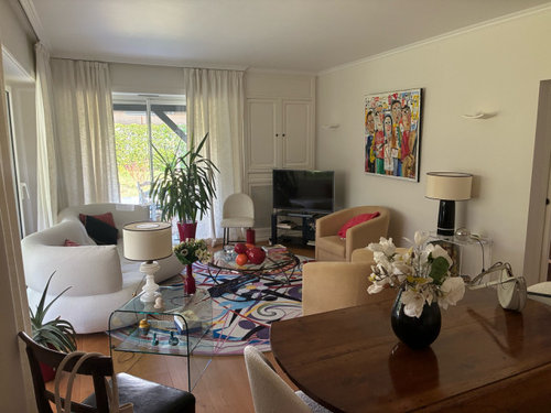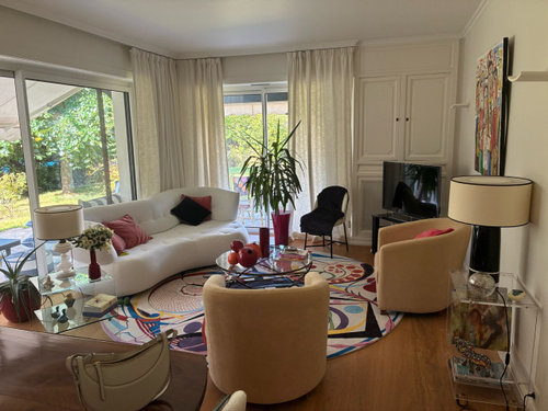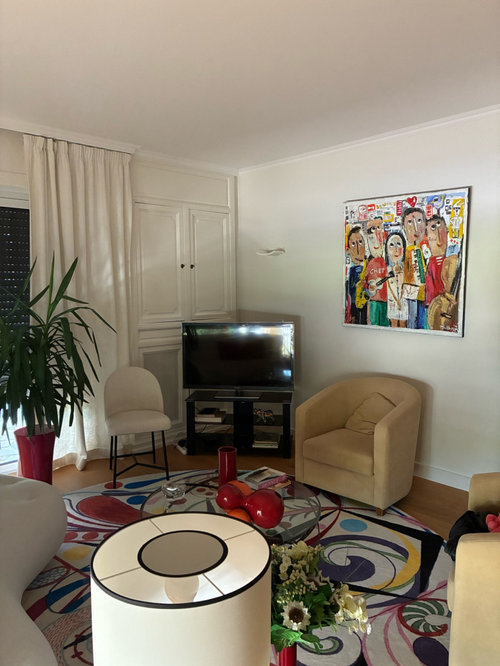 Gardez le canapé blanc. Les deux fauteuils dans des tons de violet, un plus profond, l’autre plus doux. Apporteraient un bel équilibre avec les touches rouges et colorées du salon, pour laisser les autres couleurs respiré