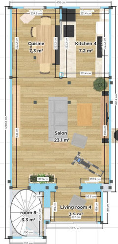 Bonjour , nous allons aménager une maison et nous cherchons des idées pour aménager voir déplacer les éléments … en effet c est une ancienne maison de ville où les pièces de vie sont au premier étage et à l époque le rdc était pour une activité artistique . On hésite à changer et garder la chambre d ami en bas et installer une cuisine en bas et le salon en haut . Mais n est ce pas étrange ? Et sinon on laisse l espace cuisine salon salle à la manger au premier étage.. mais dans ce cas on aimerai équilibrer la pièce ( îlot par exemple )