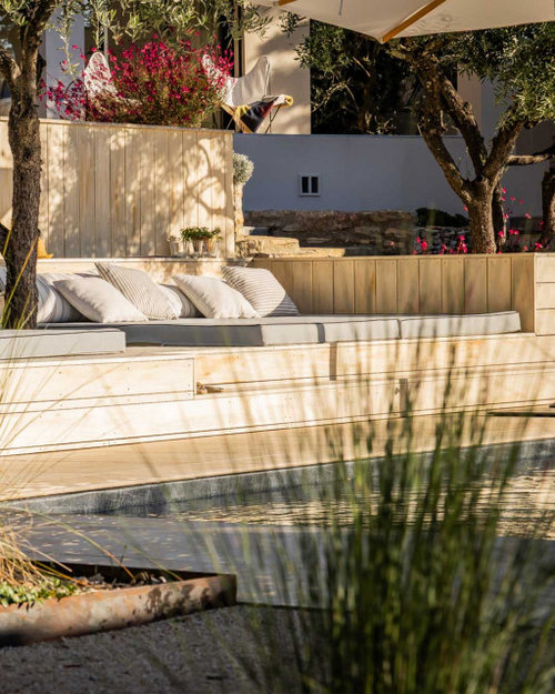 Terrasses en bois → idéales pour accueillir un salon de jardin ou des bains de soleil sur mesure, à l’ombre douce des oliviers.