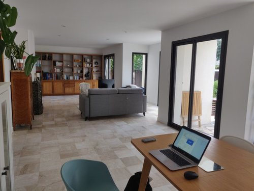 Nous nous posons la question de la place de la télé et des canapés pour profiter de la vue sur le jardin, de la cheminée et de la télé.