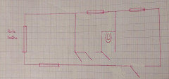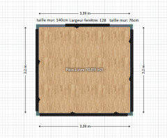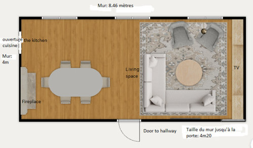 La pièce mesure environ 8,46 m de long sur 4 m de large. Je joins un plan (à l'origine en anglais, je n'ai pas réussi à supprimer certains mots, désolée!)