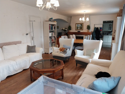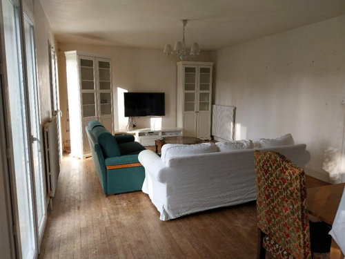 J’ai joint des photos de la pièce avant travaux, puis vide, ainsi que sans les housses de canapé. Nous sommes actuellement en train de reprendre les murs, de reboucher et de dissimuler les câbles électriques.
