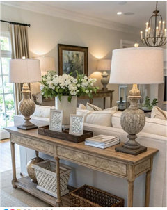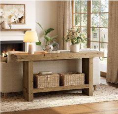 Cette console a également un vrai côté pratique : la tablette basse peut accueillir des paniers pour vos plaids, ce qui apporte du rangement tout en restant léger visuellement. Derrière le canapé, elle ferait un lien naturel entre le salon et la salle à manger.