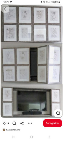 Auteur d'origineil y a 24 joursJ'ai pensé à ce genre de projet pour cacher la TV, qu'en pensez-vous ? Il faudrait peut-être un seul tableau pour ne pas trop alourdir la zone.