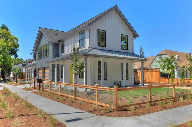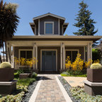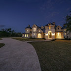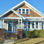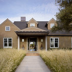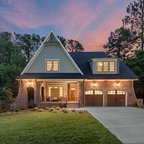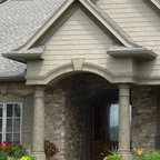 Aménagement d'une grande façade de maison multicolore classique à un étage avec un toit à quatre pans et un toit en shingle. — Houzz