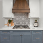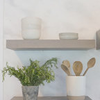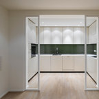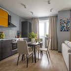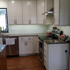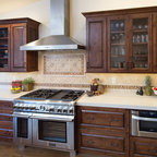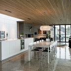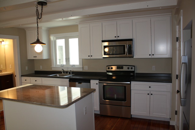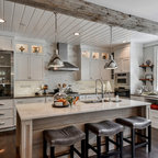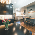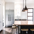 Cette photo montre une cuisine nature avec un électroménager en acier inoxydable, un sol en bois foncé et un îlot central. — Houzz