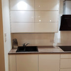 Cette image montre une petite cuisine minimaliste en U fermée avec un évier encastré, un placard à porte plane, des portes de placard blanches, un plan de travail en quartz, une crédence blanche, une crédence en feuille de verre, un électroménager blanc, un sol en carrelage de céramique et aucun îlot. — Houzz