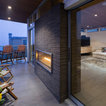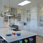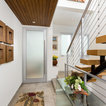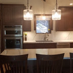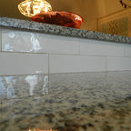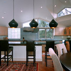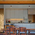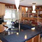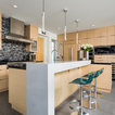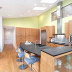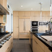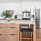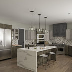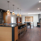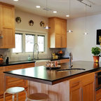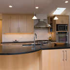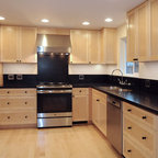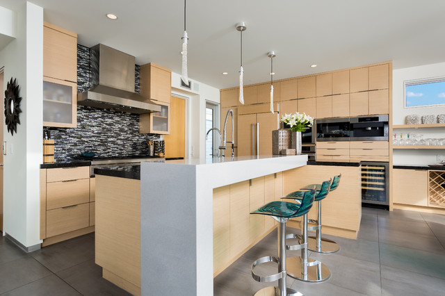 Idées déco pour une grande cuisine américaine moderne en L avec un évier encastré, un placard à porte plane, des portes de placard en bois clair, un plan de travail en quartz, une crédence noire, une crédence en carreau briquette, un électroménager en acier inoxydable, un sol en carreaux de ciment, un îlot central, un sol gris et un plan de travail noir. — Houzz