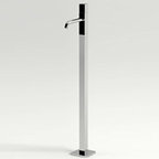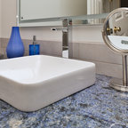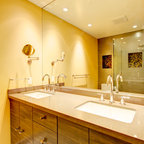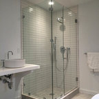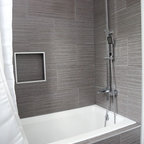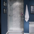 Cette photo montre une grande salle de bain principale moderne avec des portes de placard en bois sombre, une baignoire indépendante, une douche d'angle, un carrelage blanc, une cabine de douche à porte battante et un plan de toilette blanc. — Houzz