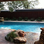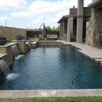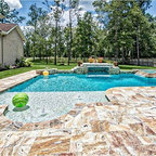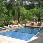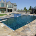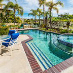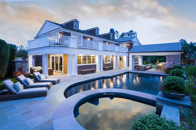 Aménagement d'une piscine arrière classique de taille moyenne et sur mesure avec un bain bouillonnant et des pavés en pierre naturelle. — Houzz