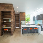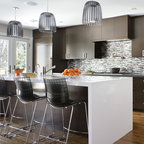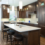 Exemple d'une grande cuisine nature en L fermée avec un évier encastré, un placard à porte plane, des portes de placard en bois sombre, un plan de travail en quartz modifié, une crédence multicolore, un électroménager en acier inoxydable, un îlot central, un sol multicolore et un plan de travail blanc. — Houzz
