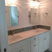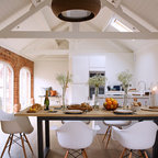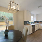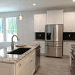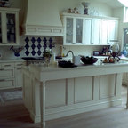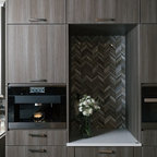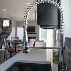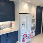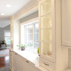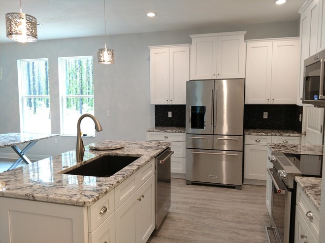 Réalisation d'une cuisine tradition avec un évier encastré, un placard à porte shaker, des portes de placard blanches, un plan de travail en granite, une crédence noire, un électroménager en acier inoxydable et un plan de travail marron. — Houzz