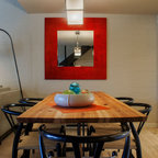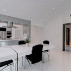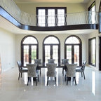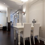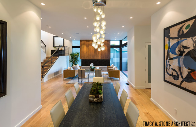 Idées déco pour une salle à manger moderne de taille moyenne avec un mur blanc, un sol en bois brun et un manteau de cheminée en pierre. — Houzz