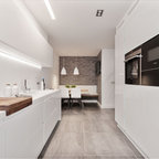 Réalisation d'une cuisine américaine tradition en U de taille moyenne avec un évier encastré, un placard à porte affleurante, des portes de placard grises, un plan de travail en quartz modifié, une crédence blanche, une crédence en carrelage métro, un électroménager en acier inoxydable, un sol en carrelage de céramique, aucun îlot et un sol gris. — Houzz