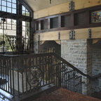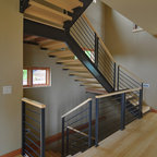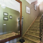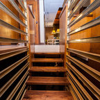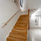 Inspiration pour un grand escalier vintage en L avec des marches en bois, des contremarches en bois peint et un garde-corps en bois. — Houzz