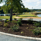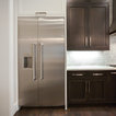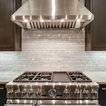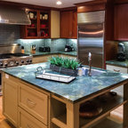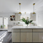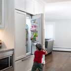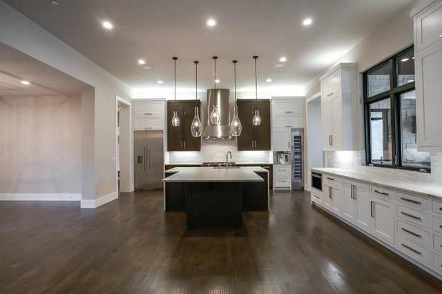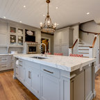 Réalisation d'une grande cuisine ouverte tradition en L avec un évier 2 bacs, un placard à porte shaker, des portes de placard blanches, un plan de travail en granite, une crédence grise, une crédence en carrelage de pierre, un électroménager en acier inoxydable, un sol en bois brun et un sol marron. — Houzz