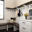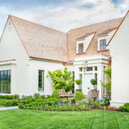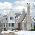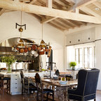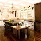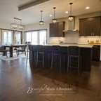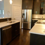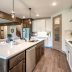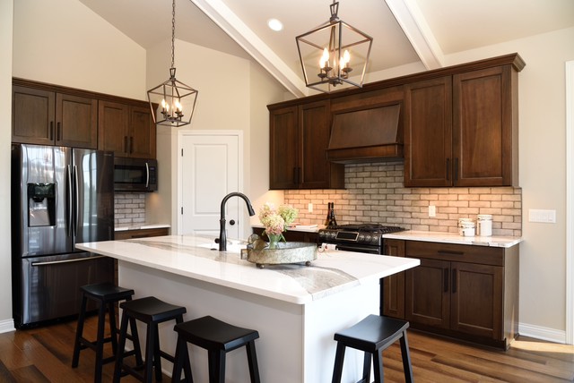 Idée de décoration pour une cuisine américaine champêtre en L avec des portes de placard en bois sombre, un plan de travail en quartz modifié, une crédence beige, un électroménager en acier inoxydable, un îlot central, un sol marron, un plan de travail blanc, un placard avec porte à panneau encastré, une crédence en carreau de céramique et un sol en bois brun. — Houzz