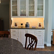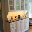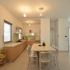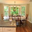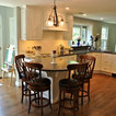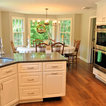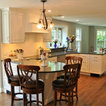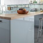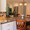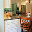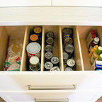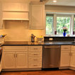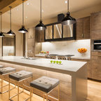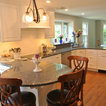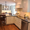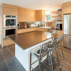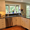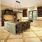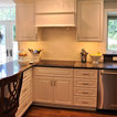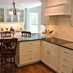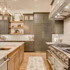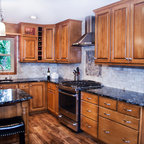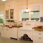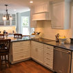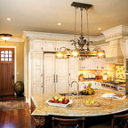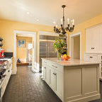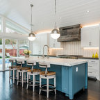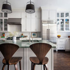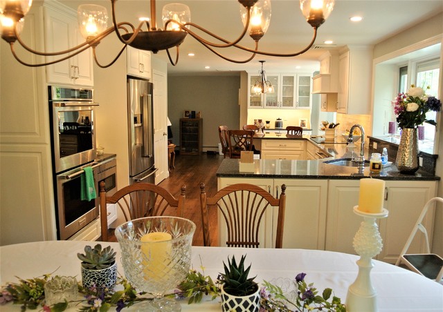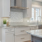 Aménagement d'une cuisine américaine classique avec un évier encastré, un placard avec porte à panneau surélevé, des portes de placard blanches, un plan de travail en granite, une crédence blanche, une crédence en carrelage métro, un électroménager en acier inoxydable et un sol en bois clair. — Houzz