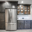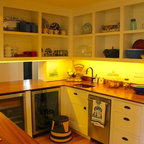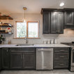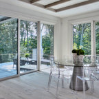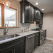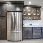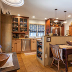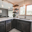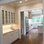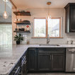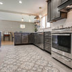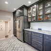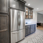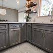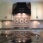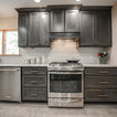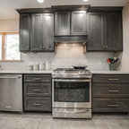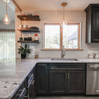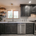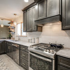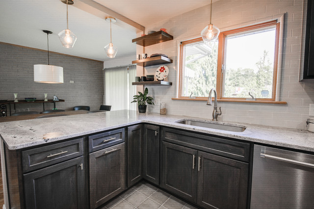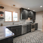 Cette photo montre une cuisine nature de taille moyenne avec un placard avec porte à panneau encastré, un plan de travail en granite, une crédence blanche, une crédence en carrelage métro, un sol gris et un plan de travail gris. — Houzz